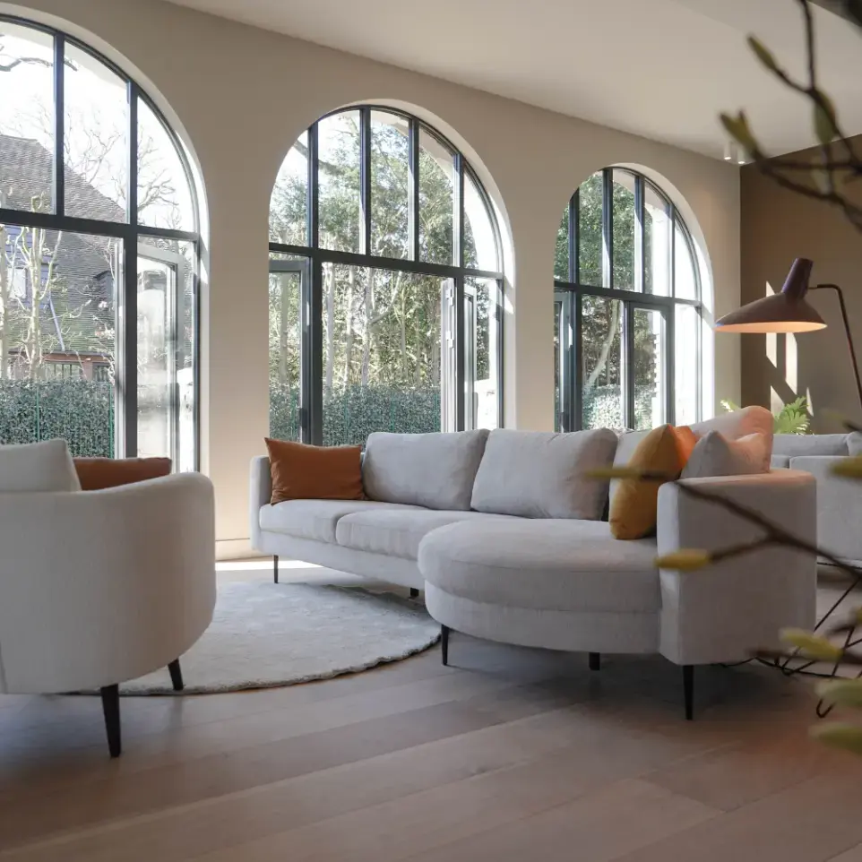 Aluminium gebogen ramen die opvallen door hun uniciteit en elegantie. Het indrukwekkende glaswerk laat volop natuurlijk licht binnen, waardoor een ruimte vol stijl ontstaat.